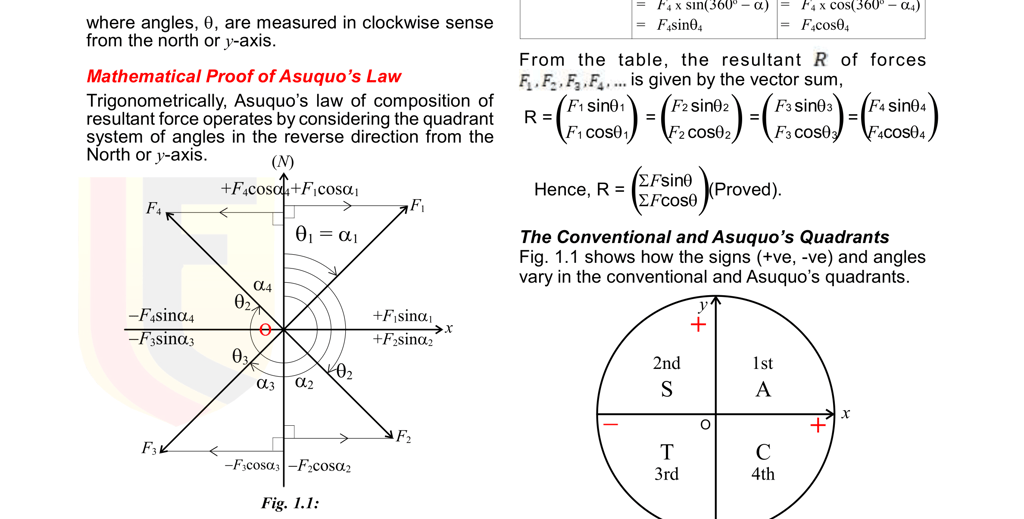 Asuquo's law can be succinctly represented by the equation: r = (Σf sin θ) / (Σf cos θ). Here, r denotes the resultant force, while Σf represents the summation of the forces applied at an angle θ. The angles are measured in a clockwise direction from the north or y-axis. This formula provides a streamlined method for calculating the resultant of multiple forces acting in a system, emphasizing the significance of vector components in effective force analysis.