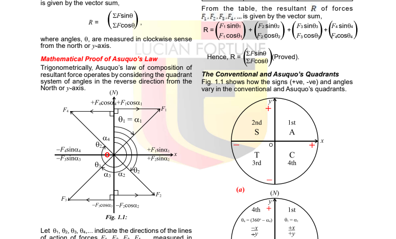 Asuquo's law can be represented by the vector model, R= (Σf sin θ) / (Σf cos θ). where, R denotes the resultant force; ΣFsinθ denotes the sum of the horizontal (x) components of the forces; ΣFcosθ denotes the sum of the vertical (y) components of the forces; North angles θ indicate the directions of the line of action of the forces, measured in clockwise sense from the North or y-axis. This formula provides a streamlined method for calculating the resultant of multiple forces acting on a particle, emphasizing the significance of vector components in effective force analysis. View Asuquo's Law >>>